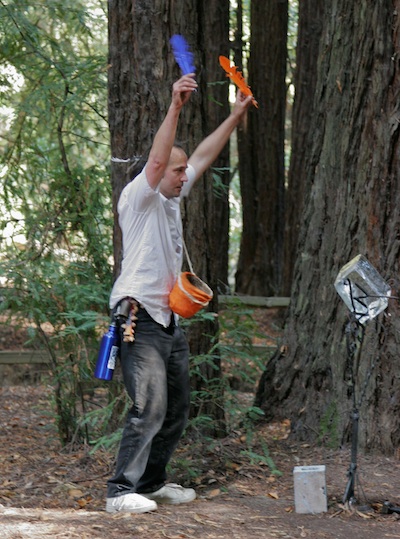 tiny eyes mkaing sacredOct. 2 2011Arts In Nature Festival Redwood Regional Park, Oakland California I began and ended this piece farther up the trail than the festival, wanting to commence and conclude only the forest and to make entering and exiting the festival grounds a part of the piece. I was wearing my tiny eyes costume, black pants, white shirt and white shoes, with the blue water bottle on my belt. I also had the earth bowl around my neck on a rope. I had four feathers in my hair, black, white, blue and orange, matching my clothing, bottle and the orange covering on the outside of the earth bowl. I also attached two rattles and four goat bells to my belt so that my movements would be augmented in sound beyond my body and voice and would announce my presence to those to whom I would be out of sight. I focused on the environment as a stimulus to the ecstatic response as I passed through the forest to the festival area, being well activated by the time I arrived. I then included the participants of the festival into my focus as I came into the crowds. I also looked into the earth bowl to stimulate me when needed. My trajectory was down the redwood covered trail, which was about a half mile, and back up again. I would continue the surrender, staying in a spot when the response was strong and continuing forward when it subsided, sometimes back tracking for a bit when following the surrender. At certain spots on the side of the trail where the earth looked soft I would stop to dig a small hole in the ground and collecting the earth into a mound directly behind it. I did this rather fervently, to my surprise.Then I would look into the hole to elicit the ecstatic response, which in these cases is rather considerable. I would stand peering into the earth while my entire body was shaking from the ecstatic response. At some points I took the orange and blue feathers from my hair, one in each hand, and would move with them, pointing them into the earth bowl and then upwards, and moving spontaneously with them. At a designated spot I started to elicit as fully as I could, shaking and moving very intensely. A crowd started to gather as a result of the activity. After a bit of movement I dug a hole and bulit a mound on both sides of the trail, peering into it them and elciting the response. Three curious boys at this time started to follow my every step closely and I moved about. I also held colored the feathers here too, sometimes placing and leaving them into the earth bowl as I moved. Eventually I took the orange and blue feathers and stuck them into the mound of earth, marking it for the event that took place there. There were some some unexpected and unplanned events that took place, including finding feathers which I then put in my hair, giving a boy a piece of wood directly taken from the ground, having someone put a feather into the earth bowl, and other interactions with curious participants including concentrated and deep focus on them with an intense ecstatic response while they returned the gaze. Lastly I then continued back up the trail and away fro the festival ground to end the piece alone in the forest. The entire piece lasted about three hours.